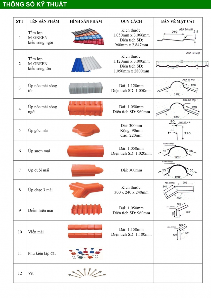 Tấm lợp M-GREEN được sản xuất theo công nghệ Châu Âu. Sản phẩm được chế tạo từ nhựa cao cấp Resin với nhựa PVC và phủ lớp ASA. Nguyên liệu sử dụng hoàn toàn không có amiăng và sợi thủy tinh.
